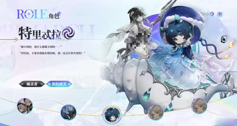 归环潆的专属契约使灵是特里忒拉,外观是一个软萌的水母形象。特里忒拉的性格也和潆有些相似,有些怕事,但其战斗与辅助能力绝对不容小觑。在一些需要解谜和推演的关卡中,特里忒拉拥有强大的核心控场能力。尤其是在面对强大的归环boss时,她可以凭借自身的冰属性技能实现快速控场,冻结敌人,为整个团队争取到宝贵的输出与续航时间,大大提升了战斗的容错率。同时,得益于其出色的探测能力,在破解各类机关谜题时也能发挥独特作用。