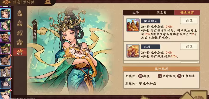 锦囊搭配上,【桃园结义】为最优解:四件套效果允许步练师在治疗一名队友时,额外将本次治疗量的15%均分给当前生命百分比最低的两名友方单位,极大扩展治疗覆盖范围;两件套仅提供10%基础生命加成,功能性较弱。若暂未集齐该锦囊,【屯粮】为可靠替代方案——其四件套可提升步练师全部治疗效果20%,配合装备与副属性进一步叠加,可显著放大其奶量上限,打造高强度续航核心。