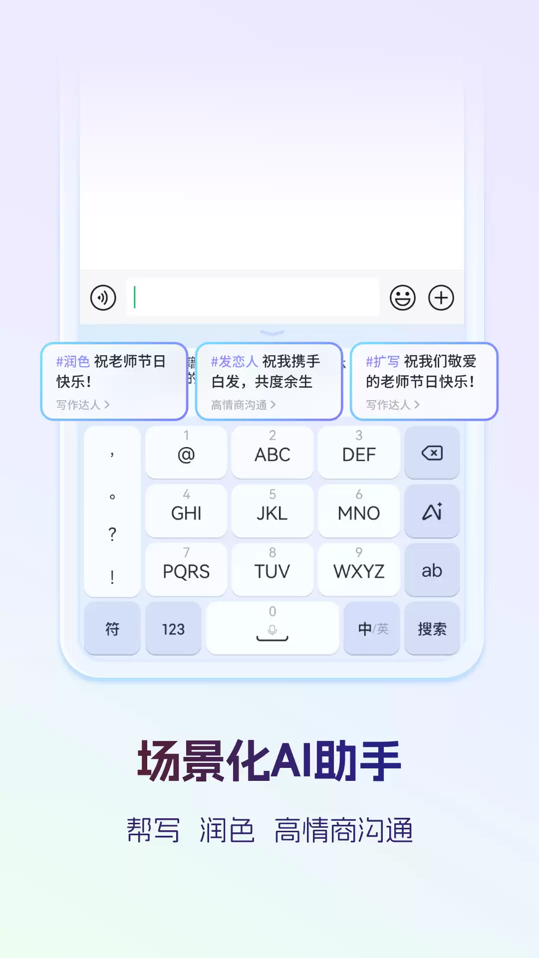 集成拼音、手写、语音三重输入通道,具备上下文感知型纠错机制,即使存在拼写偏差也能准确还原目标词汇。AI辅助回复功能可根据聊天内容生成适配性话术建议;同时提供多款主题键盘皮肤,满足个性化视觉偏好,提升长期使用舒适度。