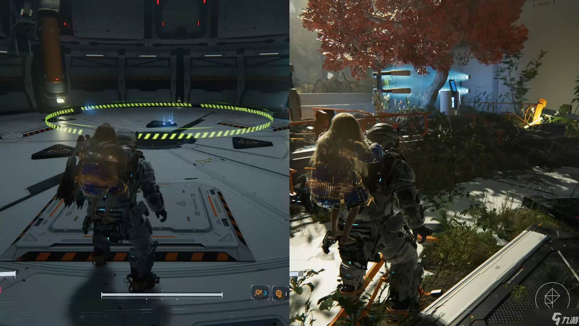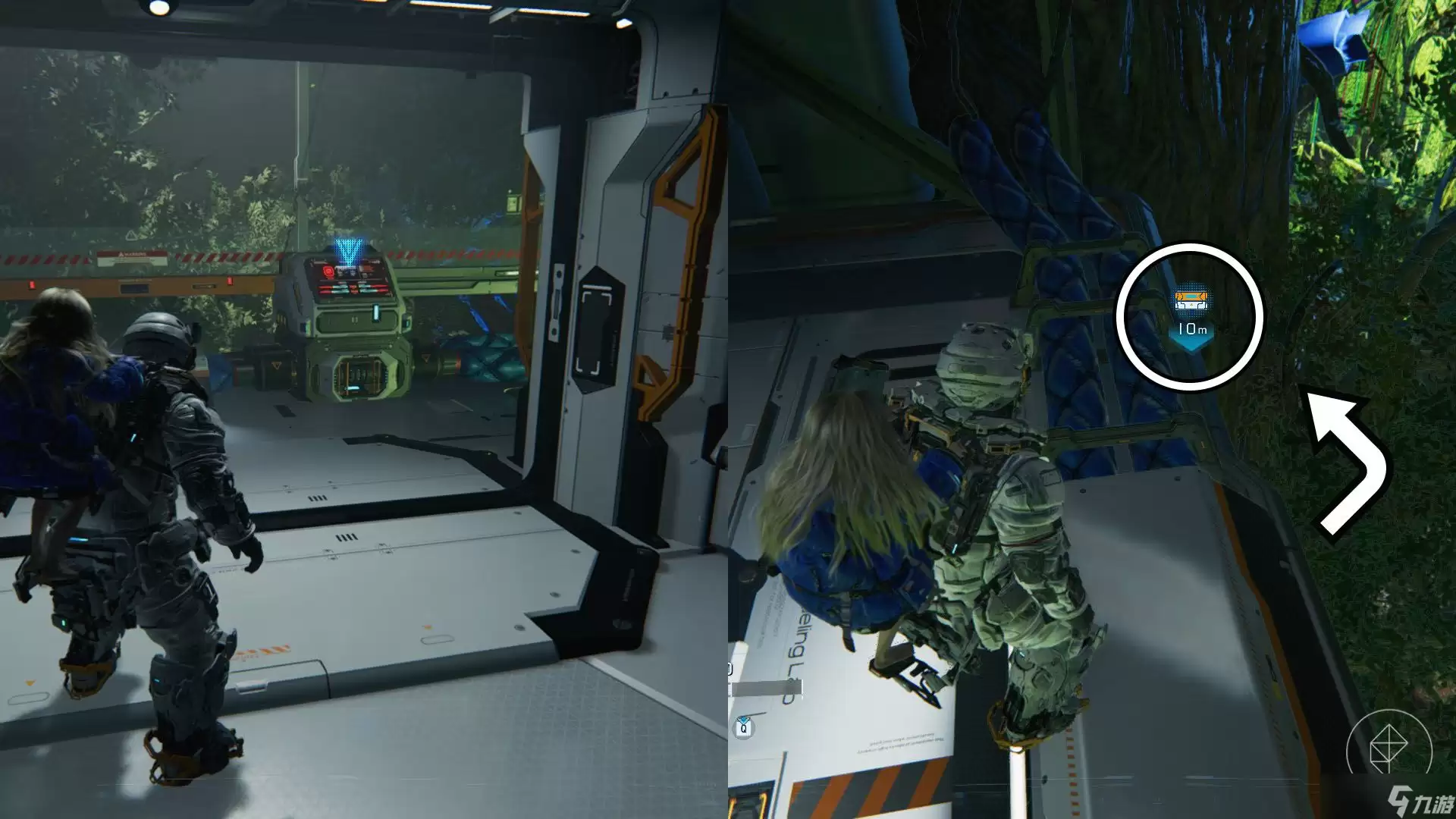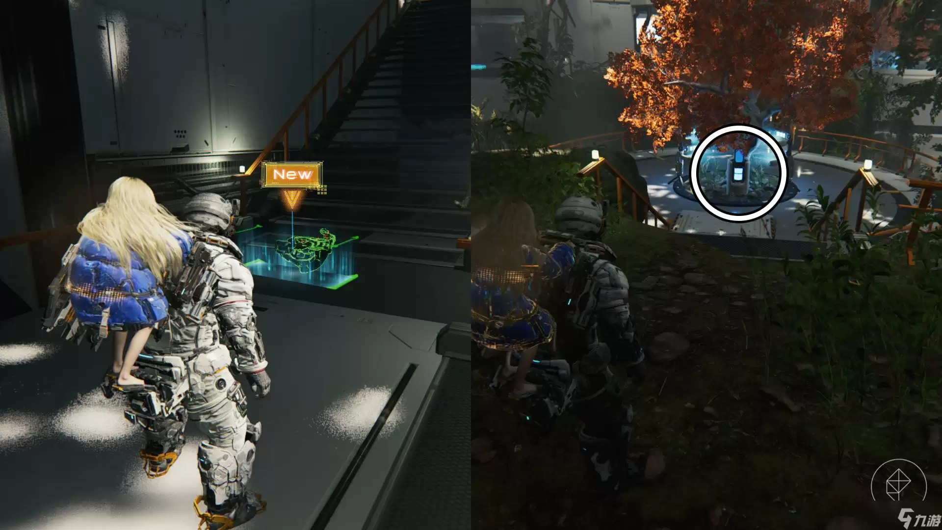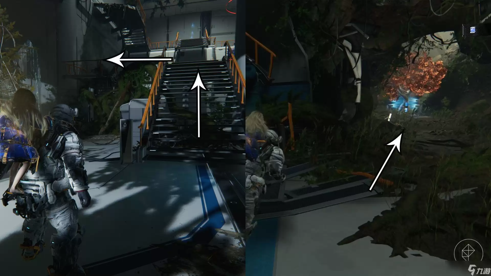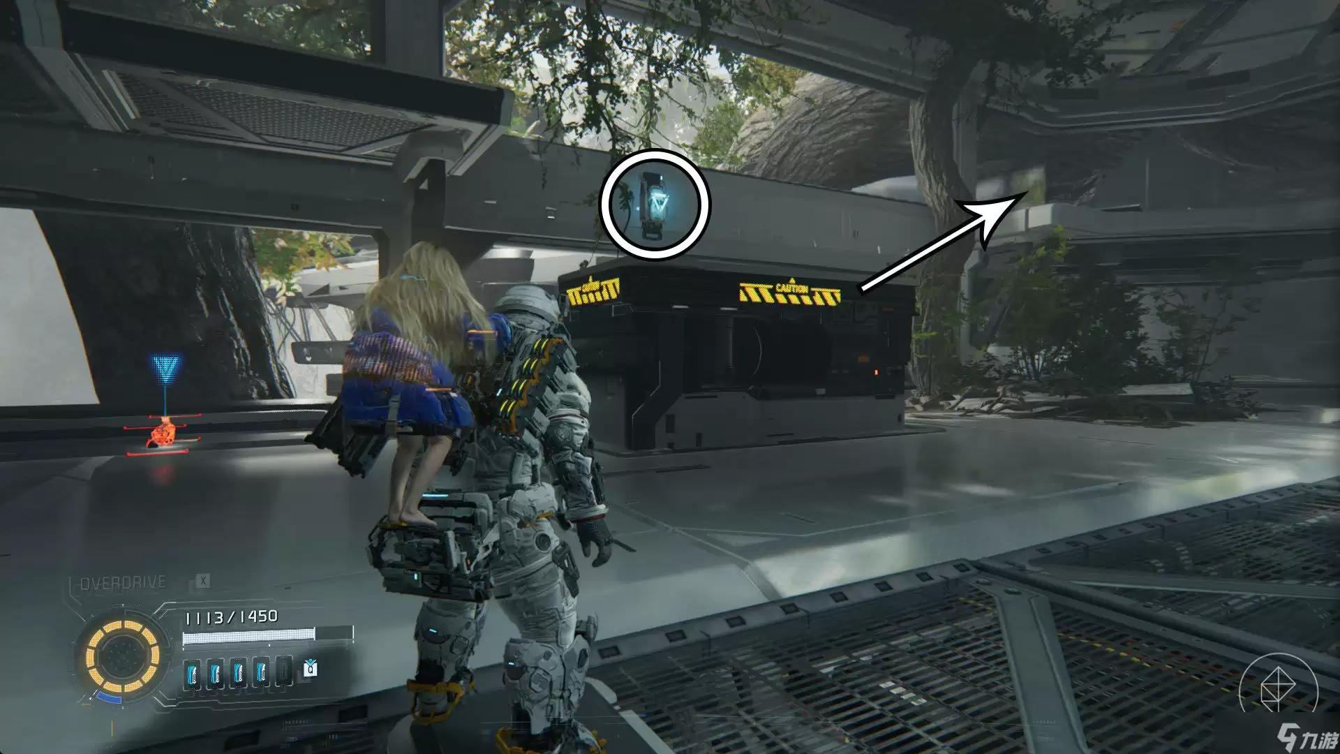 走下舱口旁边的楼梯,找到一个机器人和另一棵带有Gen Chip的橙叶树。在右侧,你会找到一个升级组件和藏在树间的步行者,在其身后藏着一个Balloons REM。