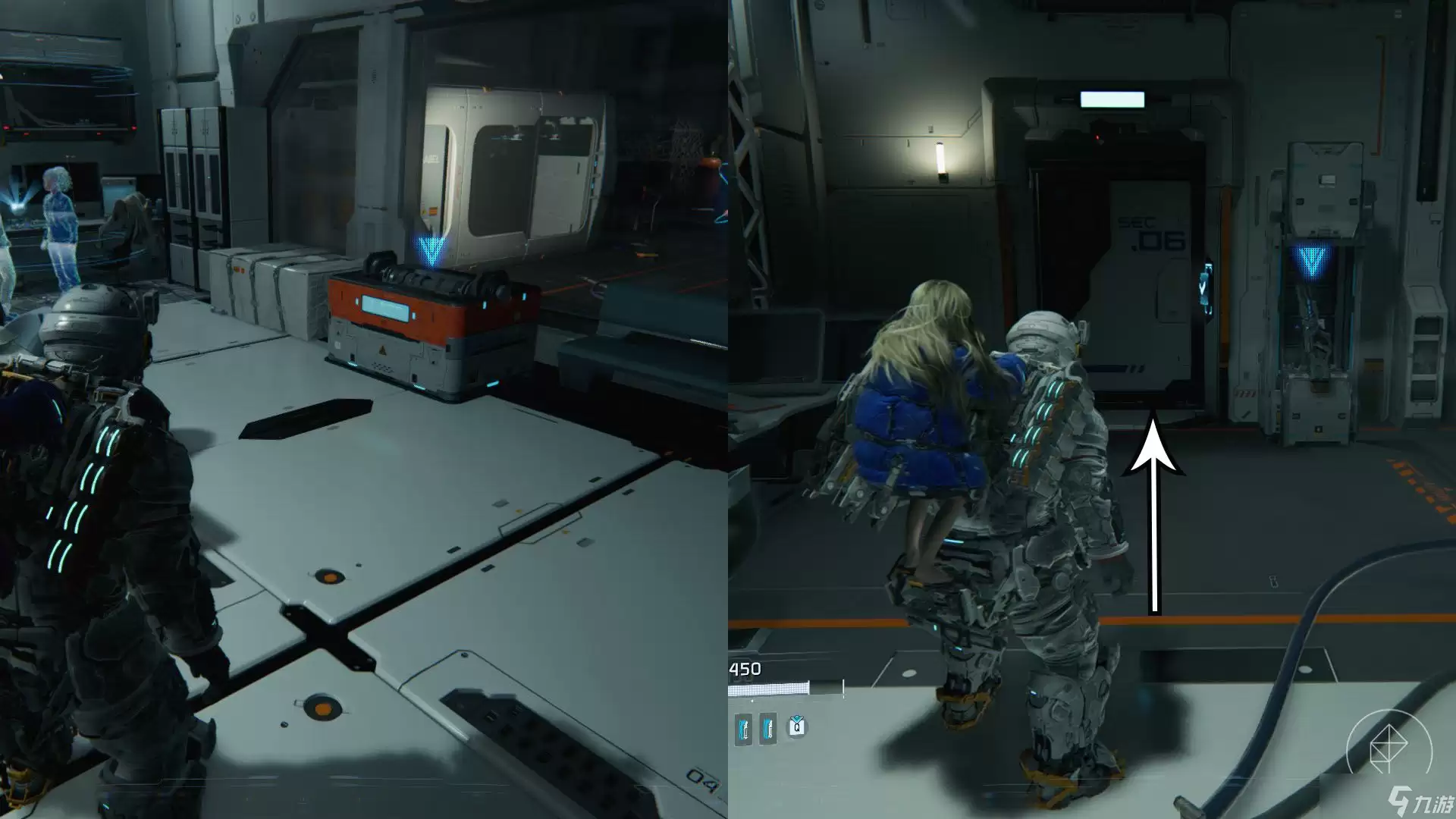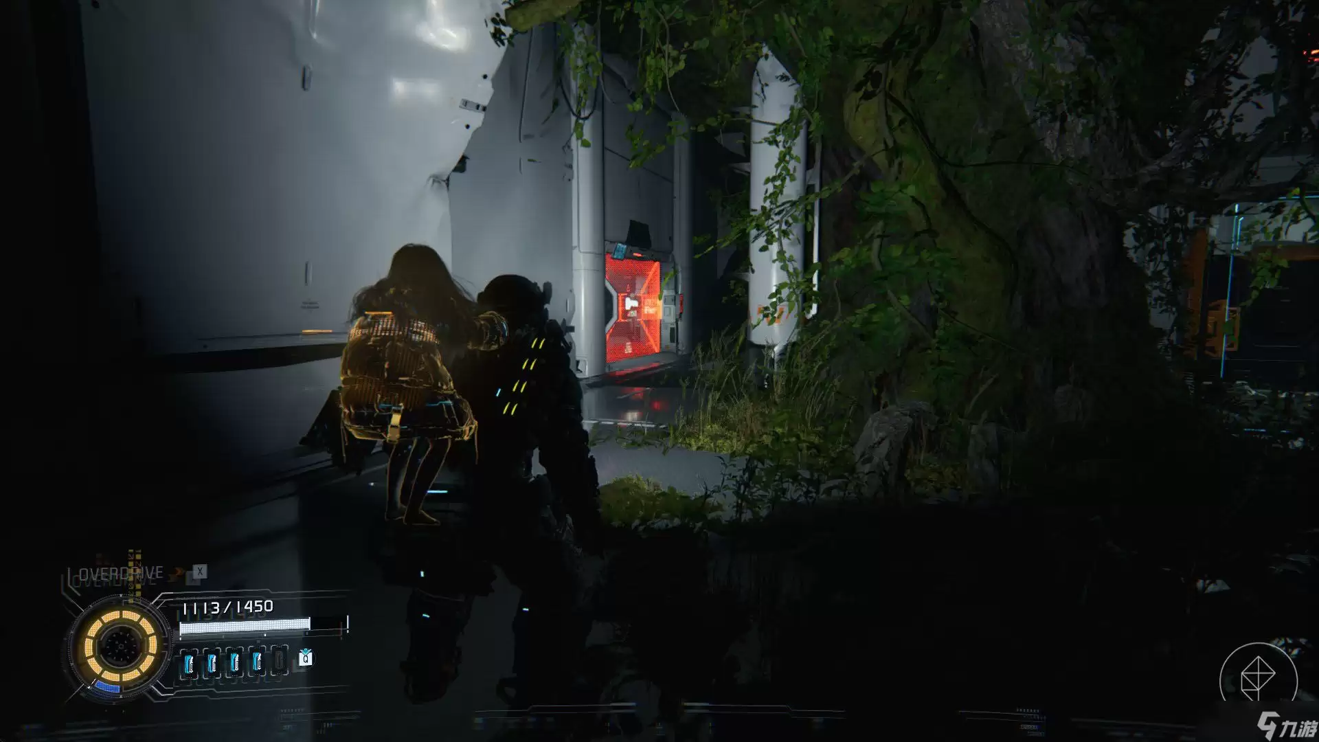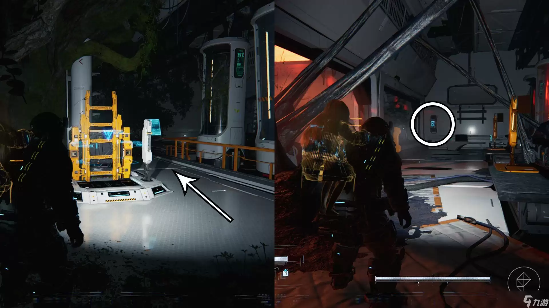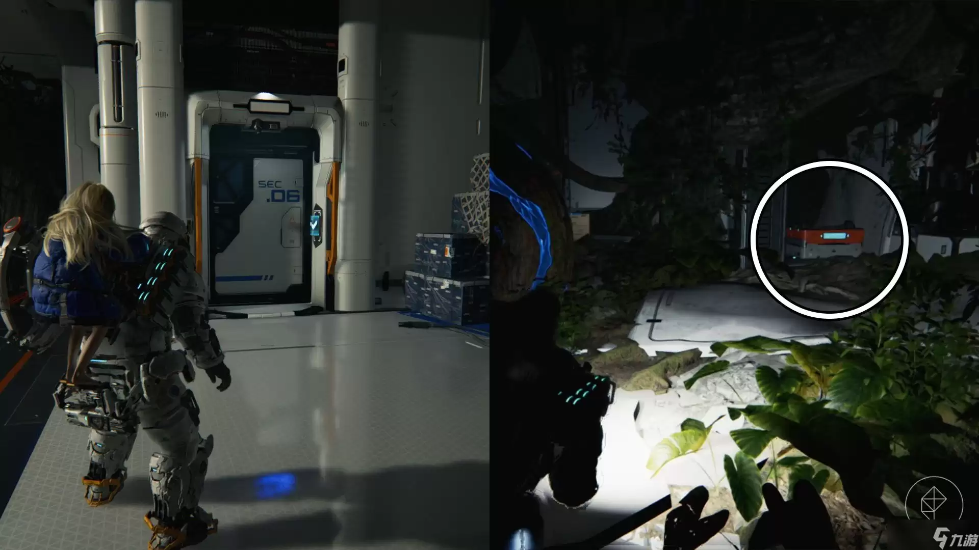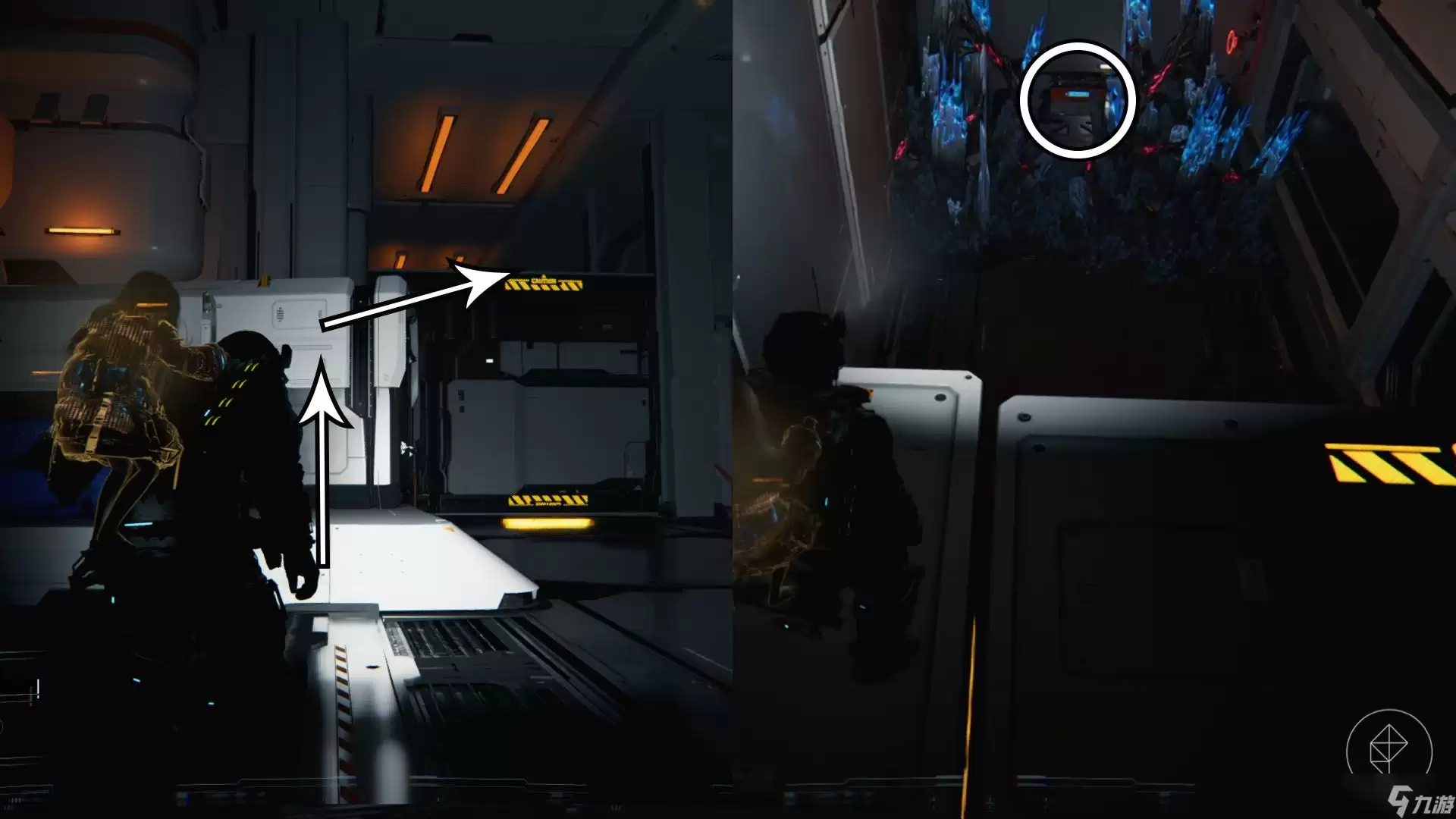 回到走廊,沿门左侧的路径走以获取升级组件。进入室内触发简短动画。向右转找到逃生舱口和一道红色大门。解锁舱口可回避难所存档,或者直接解锁红色大门进入。