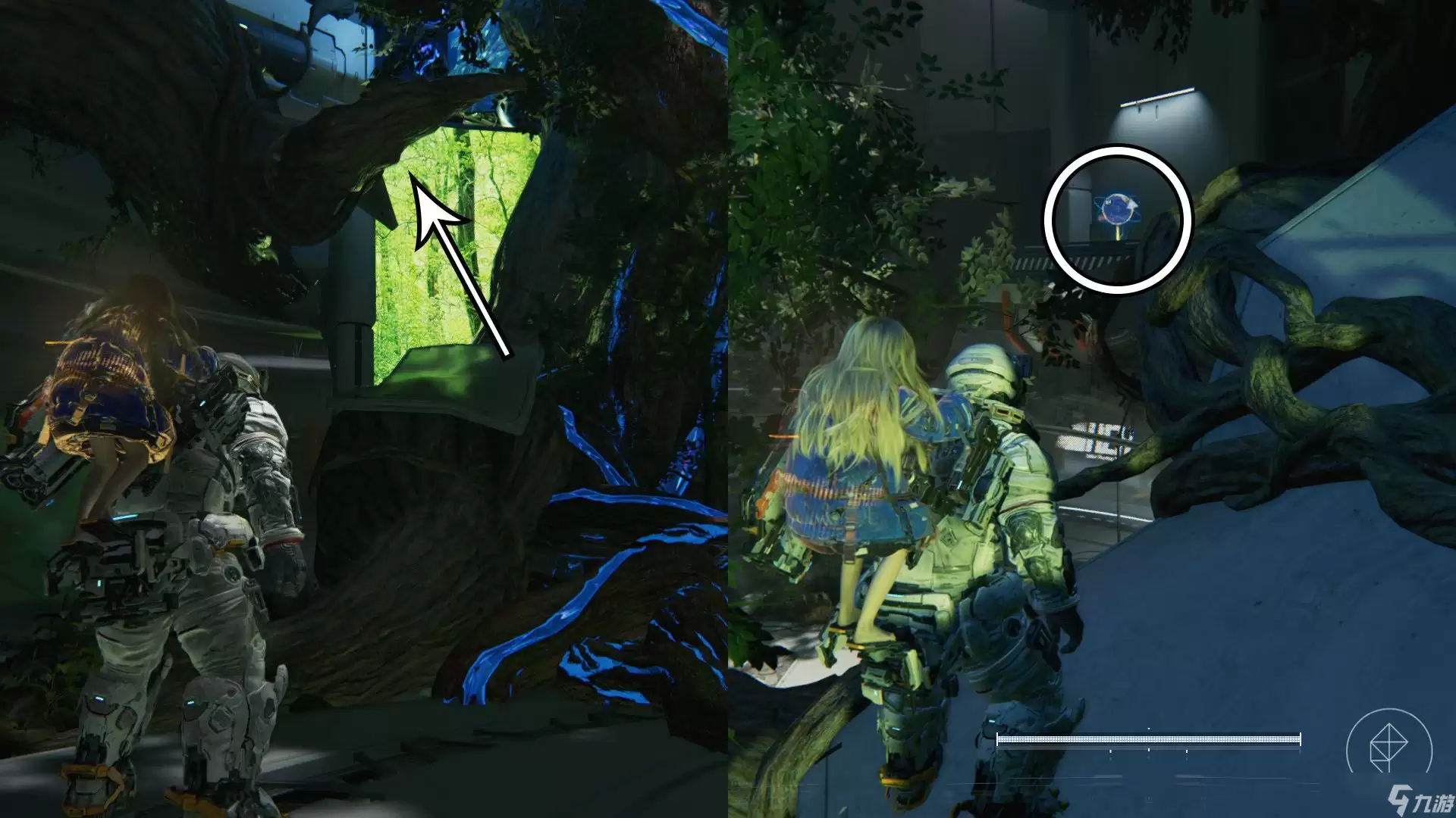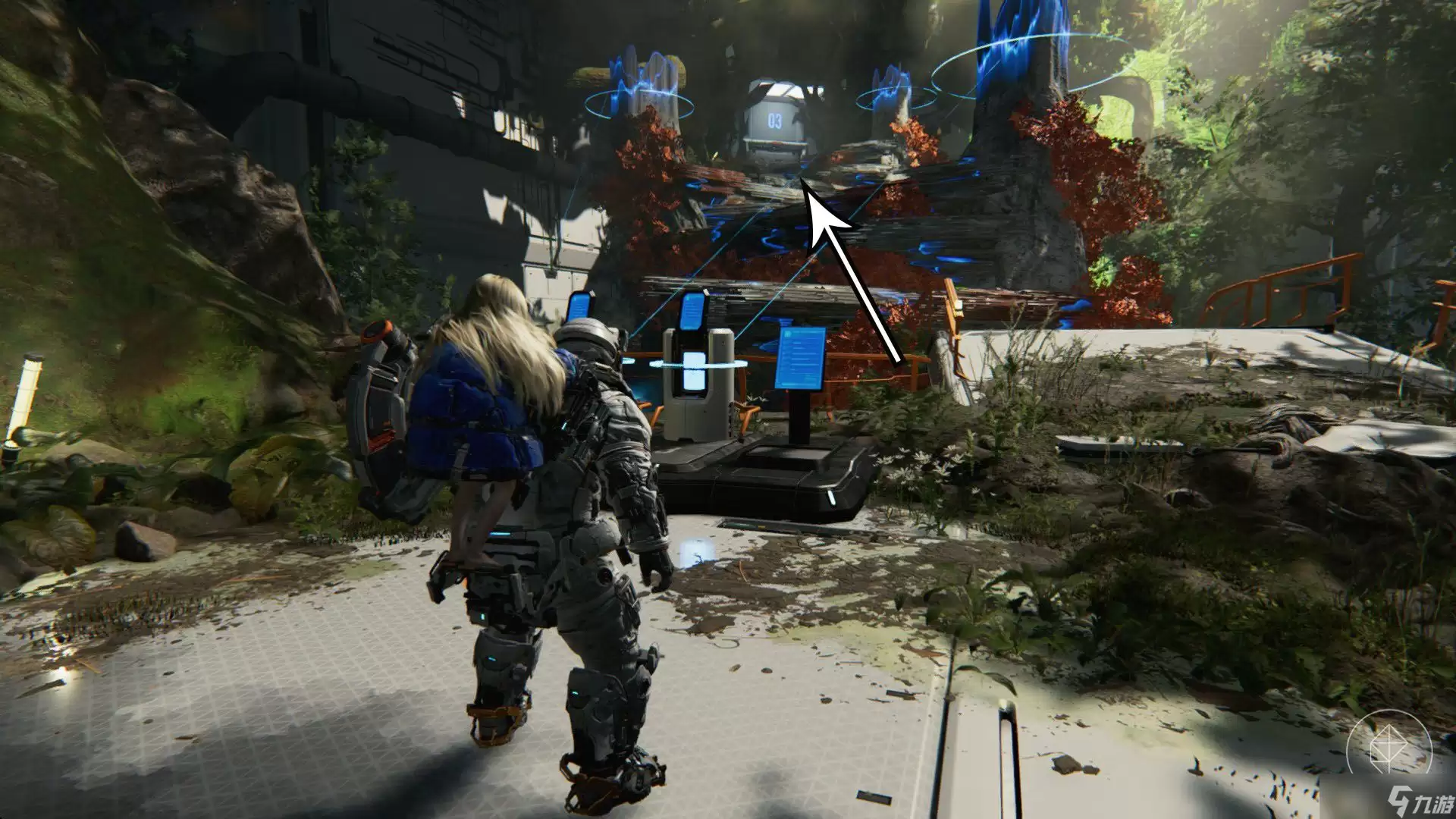 之后从树上获取Gen Chip(基因芯片)并将其带回楼顶的机器。它会生成一个树枝平台,让你能到达楼梯顶端。但在跳上去之前,看向机器右侧上方,找到一个终端,黑入它以消除前方的激光。