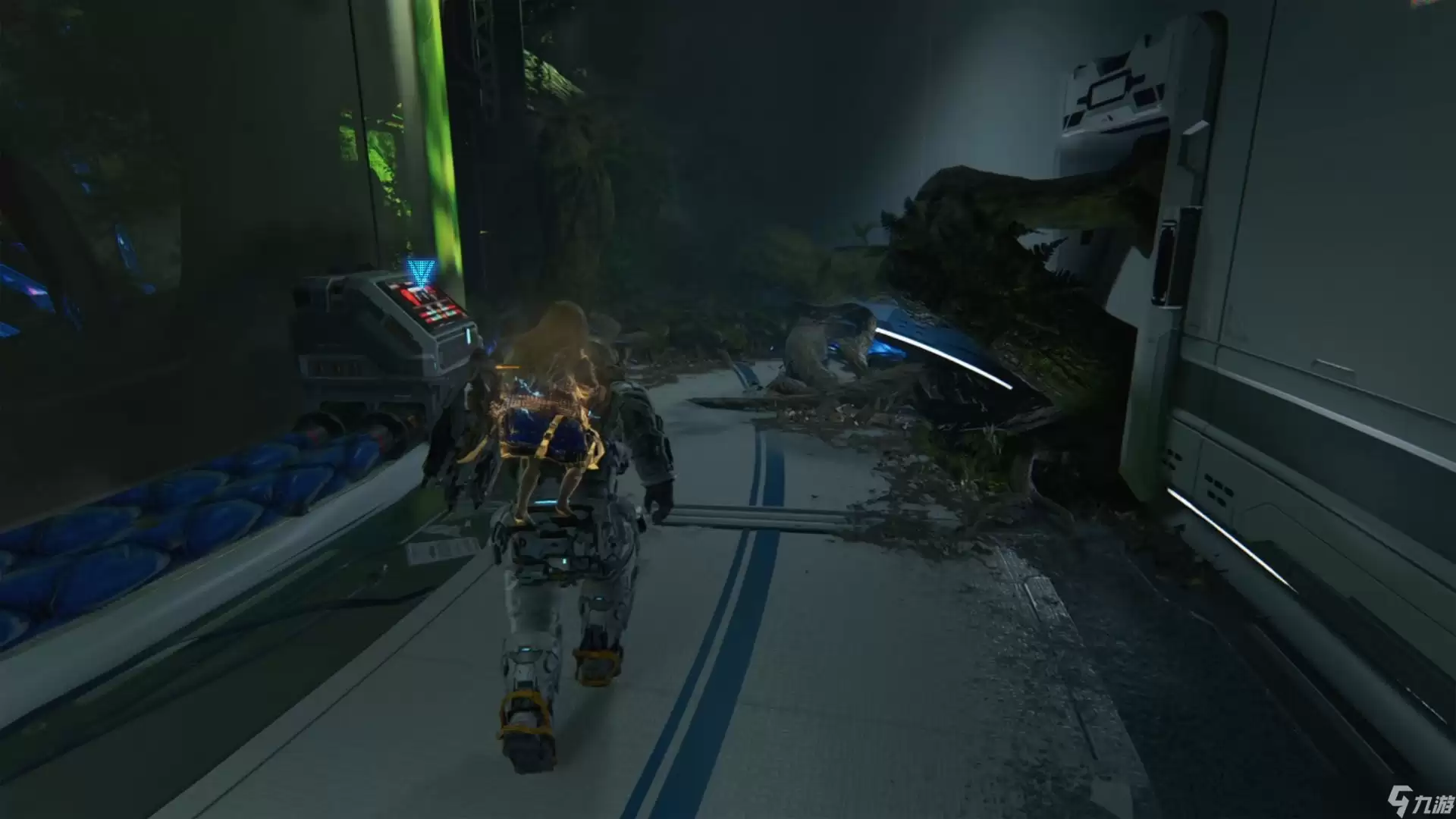 击败敌人后进入下一房间,找到损坏的驾驶舱、训练数据、Cheap Shot(廉价一击)模组和一份文件。乘电梯上去找到脉冲卡宾枪,它现在可以作为你的主武器。进入下一房间与控制面板互动,清除树木并解锁升降梯。