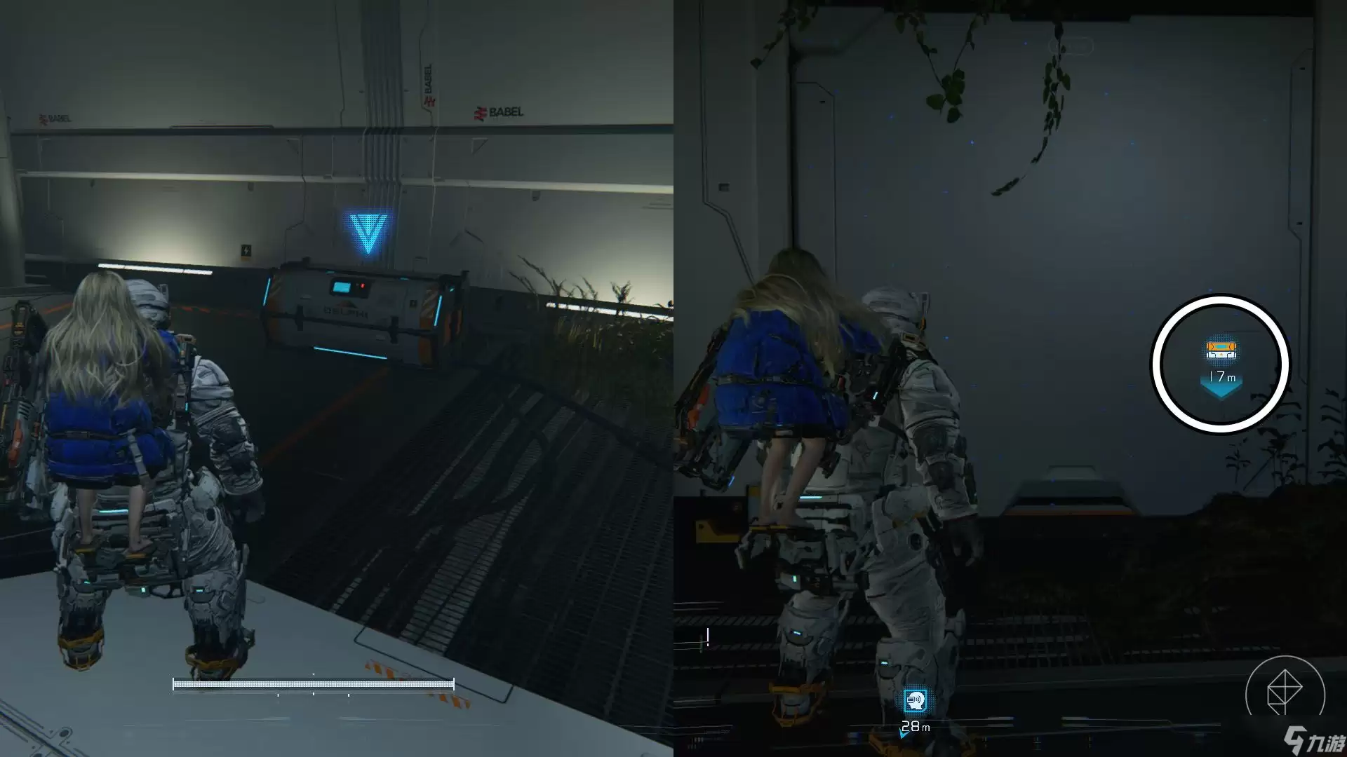 与下一个房间的控制面板互动,玻璃墙会打开,但不要立即跳下去。转到左侧并紧贴墙壁缓慢滑下。你会降落在一个带有保险箱的平台上。落入下方区域,前往植物工厂。