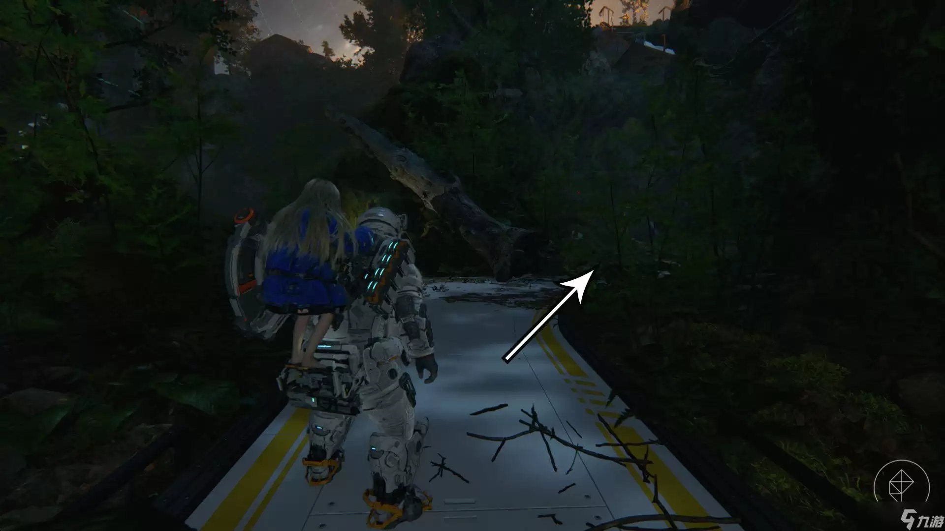 走出室外进入开阔区域,沿着树木路径前进。在尽头处,你会看到一台吊着箱子的橙色起重机。跳上箱子,再跳到前方的白色平台上。在前方草地区域,你可以找到一个保险箱。