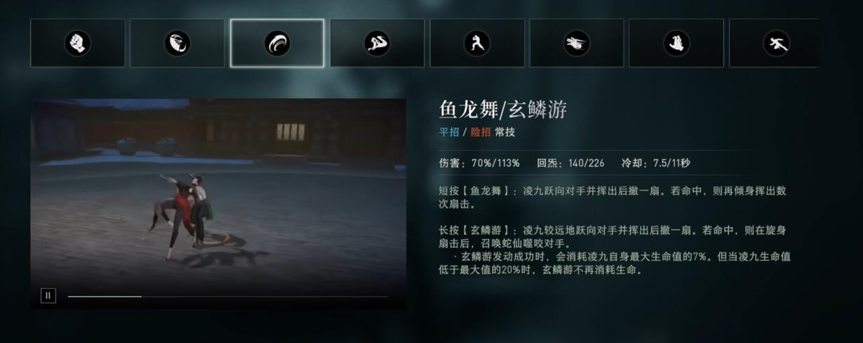二技能鱼龙舞是属于一个突进输出技,短按跃向对手扇击,距离近适合贴身战,如果大家长按的话跳的就更远了,旋身扇击后还跟蛇咬,长按突进过程中也是能调整方向,绝技血飨有两种模式,长按能吸血回炁,吸满了扔扇召唤蛇仙真身,还能再回血,单独放容易空,最好放在其他技能中穿插。