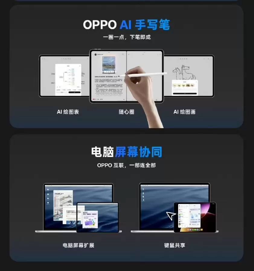 生产力方面,全景自由窗操作直观,一推一拉切换大小、四指捏放调整布局、上轻推进入平铺视角、双击小窗秒变全屏,多任务处理更高效。OPPO AI手写笔支持AI绘图表、AI绘图画,配合电脑屏幕协同,可实现屏幕拓展与键鼠共享,跨设备协同更流畅。