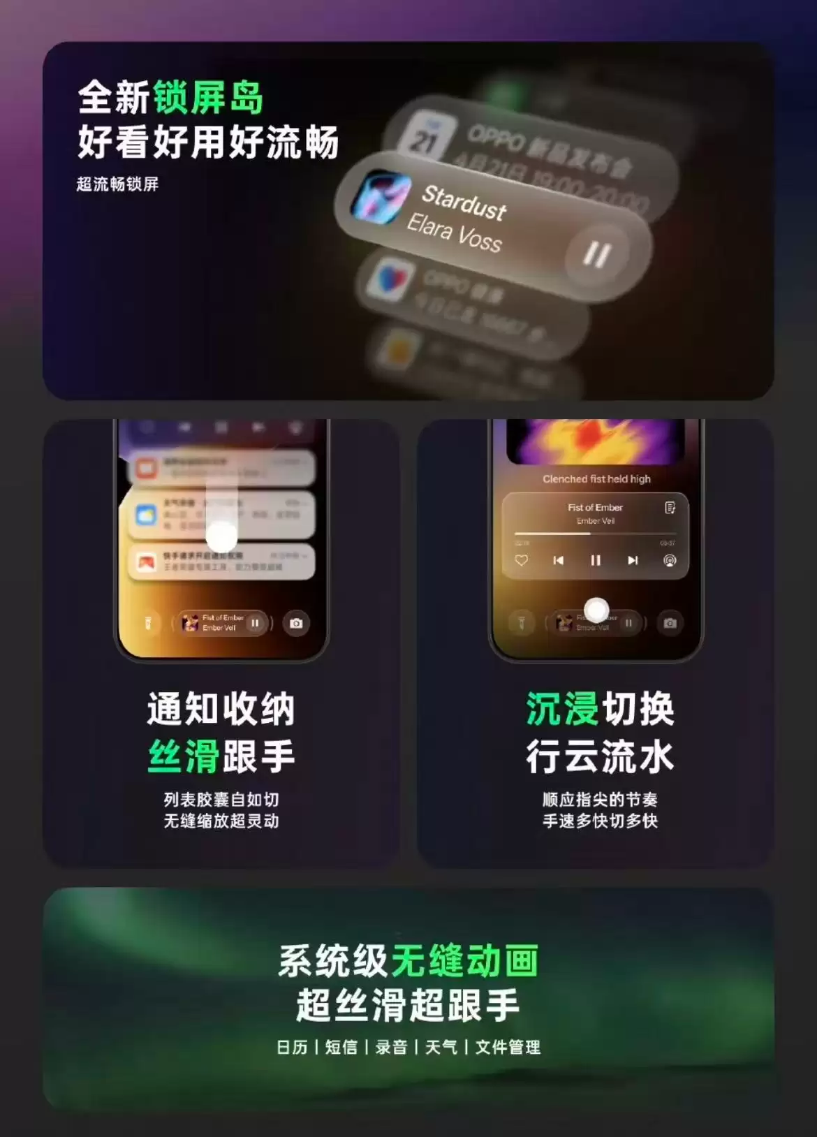 ColorOS 16核心亮点集中在交互与AI能力。全新锁屏岛支持通知收纳、丝滑跟手操作,搭配系统级无缝动画,可实现沉浸切换与灵动缩放,同时支持音乐、导航、倒计时等锁屏沉浸态,适配主流音乐与地图应用。