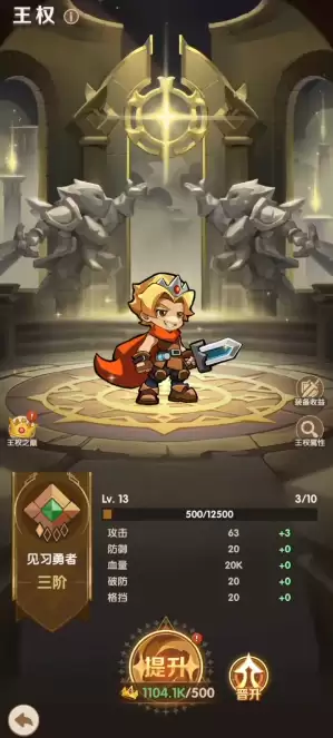 第一天大家可能接触的内容比较多的时候,很多玩家此时对于完成优先级可能比较混乱,但是建议大家开始的话,只要通过主线就可以快速的提升战力,毕竟这里的王权系统就是非常重要的一个等级系统,点击游戏当中皇冠的地方就可以进入这个系统,提升的王权系统当中大家就可以看到自身战力的加成是什么样的,另外很多的功能基本都是通过王权相应的等级来进行解锁的,所以在这里大家要通过各种方式来提升王权系统的等级,而另外游戏当中如果要快速的提升自己战力去进行通关的话,一定要在战力足够的时候搭配更多的伙伴,因为在伙伴这个系统当中,大家基本是可以看到各种阵容加成效果的,另外跟这个加成效果差不多的就是魔法,魔法系统当中,大家也可以看到差不多的培养思路。
