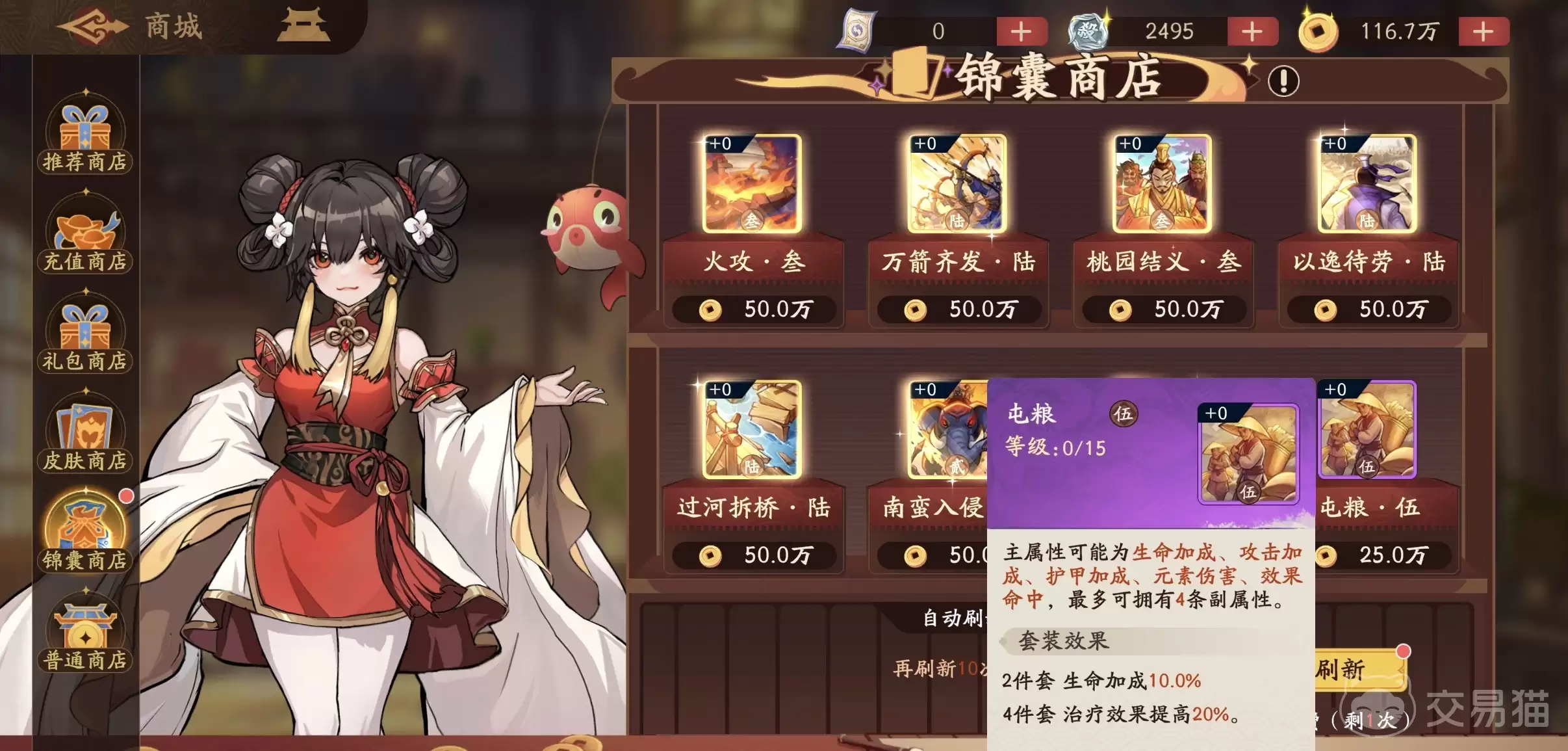 锦囊方面,“屯粮”套装是最佳拍档:两件套提升最大生命值,四件套则直接增加治疗效果数值,完美契合需求。