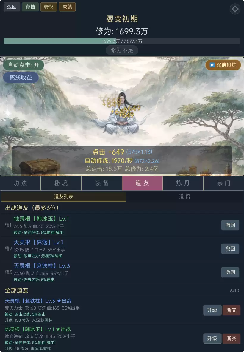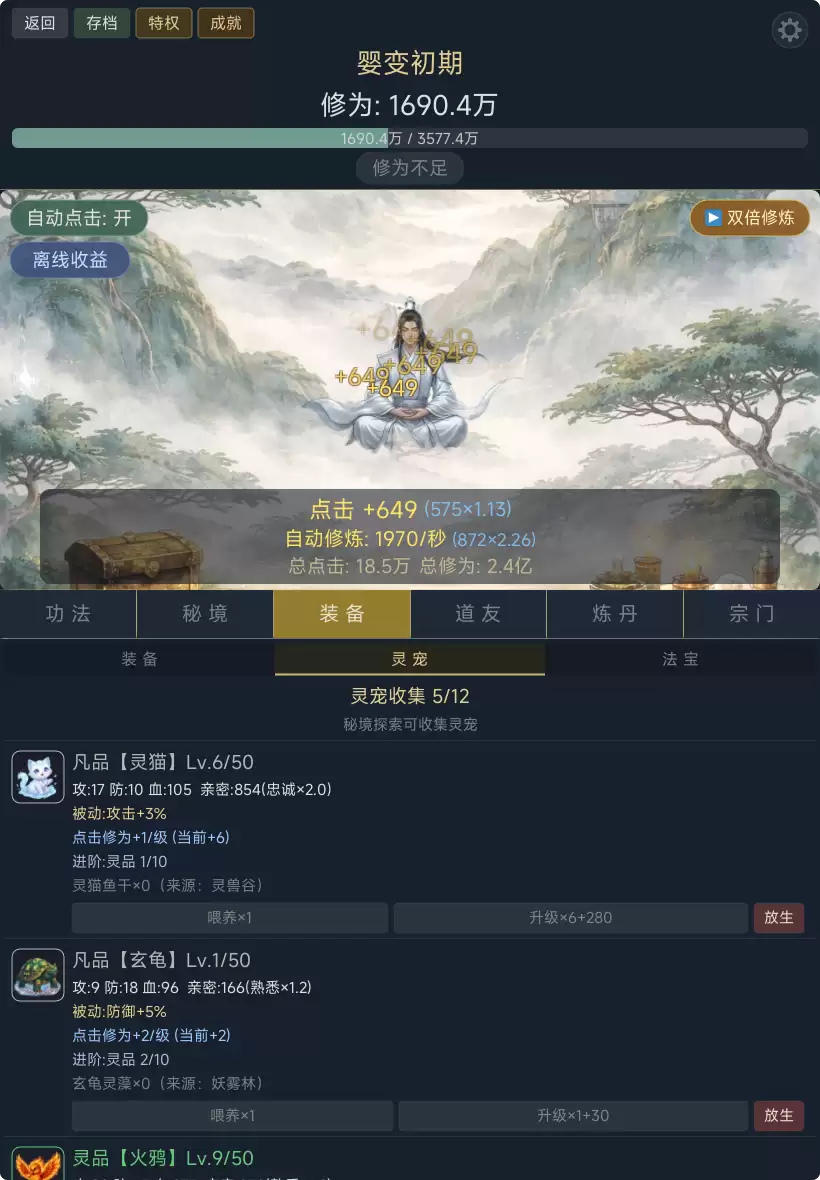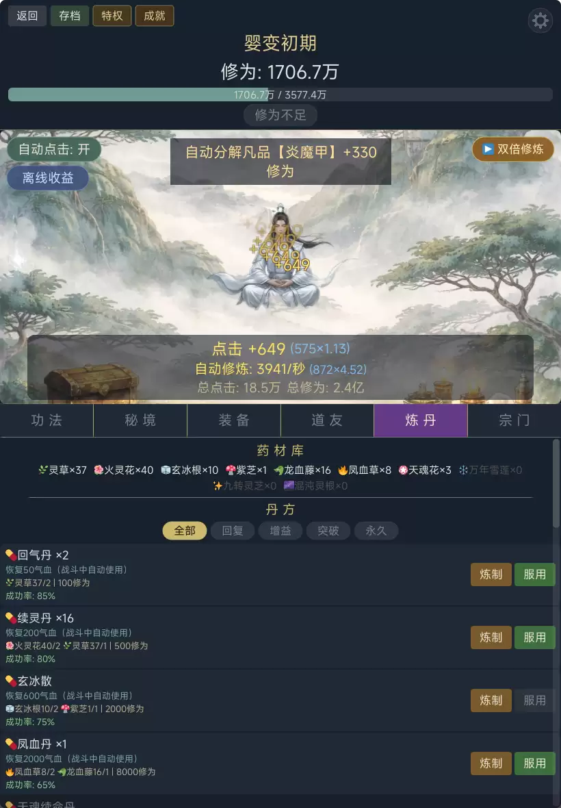 一款水墨画风的修仙放置点击游戏。点击屏幕积攒灵气,从凝气散修一路突破至空劫大天尊,历经十七重境界、六十余层修为,体验完整的修仙之旅。【修炼功法】提升点击与挂机收益,修炼途中随机触发奇缘——仙人指路或走火入魔,惊喜与风险并存。【秘境探索】十二座秘境从灵溪谷到劫道深渊,层层推进挑战怪物与Boss,选择简单、普通、困难、地狱四档难度,风险越高奖励越丰厚。【道友招募】二十六位道友各怀绝技,从初入江湖的王小石到谪仙人李太白,每人拥有独特被动技能,攻击加成、暴击强化、秘境福缘各有所长。【装备法宝】武器、防具、灵饰三大槽位,凡品到神品四级品质,十二种法宝由秘境Boss专属掉落,收集强化打造最强战力。【宗门修炼】御剑宗、丹鼎宗、蛮荒殿、天符阁、合欢宗五大宗门各具特色,拜入宗门解锁专属功法与永久属性加成,贡献宗门积分逐级研修。【炼丹采药】采集灵草炼制各类丹药,回血丹、攻击丹、渡劫天丹等助你突破瓶颈、征战秘境。【成就系统】百余项成就覆盖修炼、战斗、装备、社交等方面,达成即获永久属性加成与背包扩容。【离线挂机】关闭游戏后灵气自动积累,随时随地佛系修仙。指尖之间,证道成仙。