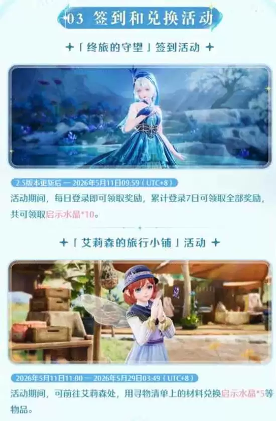 活动期间,每日将解锁一份加密快报,搭配师们可逐步揭开2.5版本的神秘面纱,提前了解新版本内容。参与解密即可领取启示水晶、共鸣水晶及各类养成材料等实用奖励。