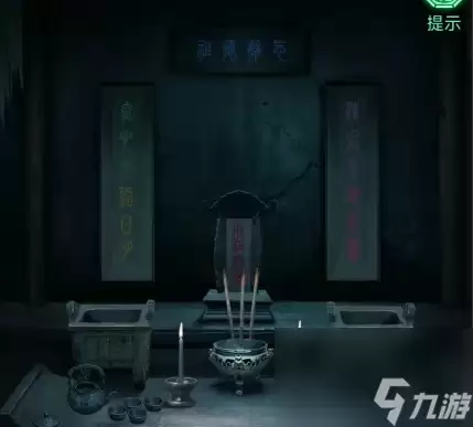 7、最左边的墓室,地上有火盆,点击火盆完成拼图,获得不同的颜色和数字信息,使用勺子在香炉上取一把香灰,把香灰倒进茶壶里,获得装满香灰水的茶壶,使用茶壶把香灰水倒进杯子里,再次获得四字密码“禄寿福喜”,使用剪刀在烛台上烤获得烧红的剪刀。
