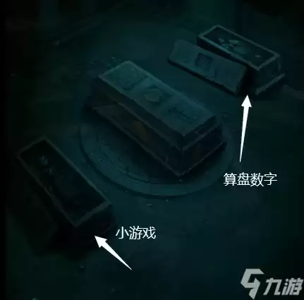 4、进入右边的墓室,第一个棺完成小游戏可打开,第三个棺根据之前算盘记载的数字把白点挪到45352的位置可打开,左上角有一个箱子,使用“仁义礼智”打开箱子,获得一把剪刀。