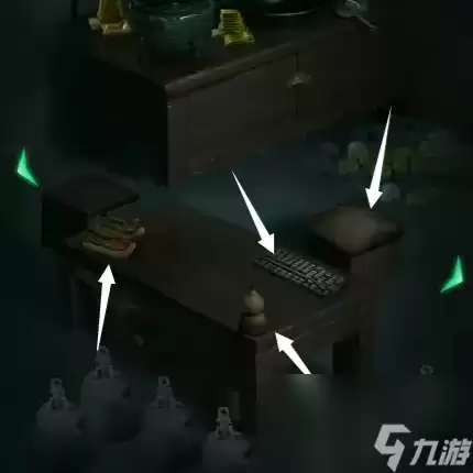 9、根据金饼信息,加上最左边墓室筷子上的红色“木”,写着蓝色“火”的青铜鼎,写着蓝色“香土”的陶罐,以及另一边墓室的写着绿色“水”字的玉簪,可解开主墓室左边的密码,停止射箭。
