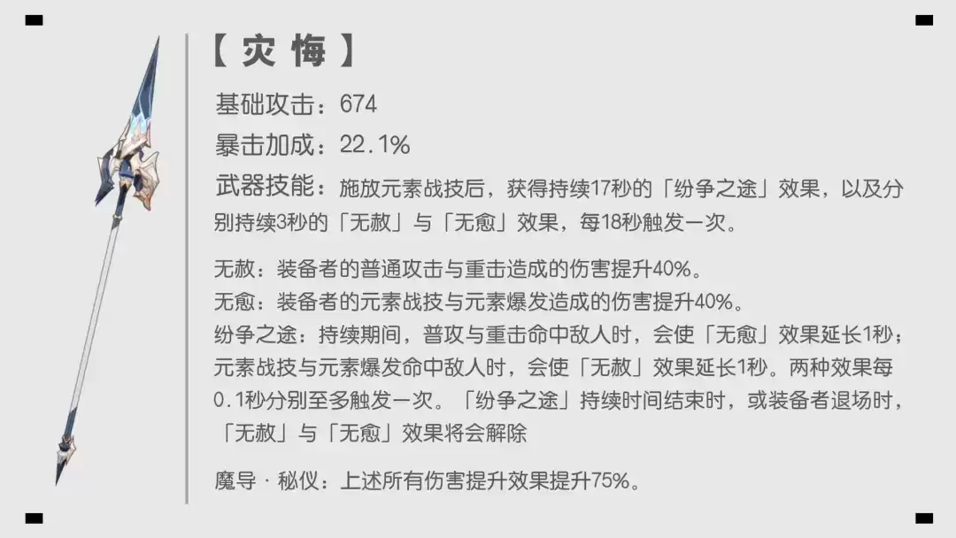 新版本即将上线两把五星武器:法器【尘光七谕】与长柄武器【灾悔】。前者机制较为常规,后者的技能加成虽高,但触发条件却颇为尴尬。