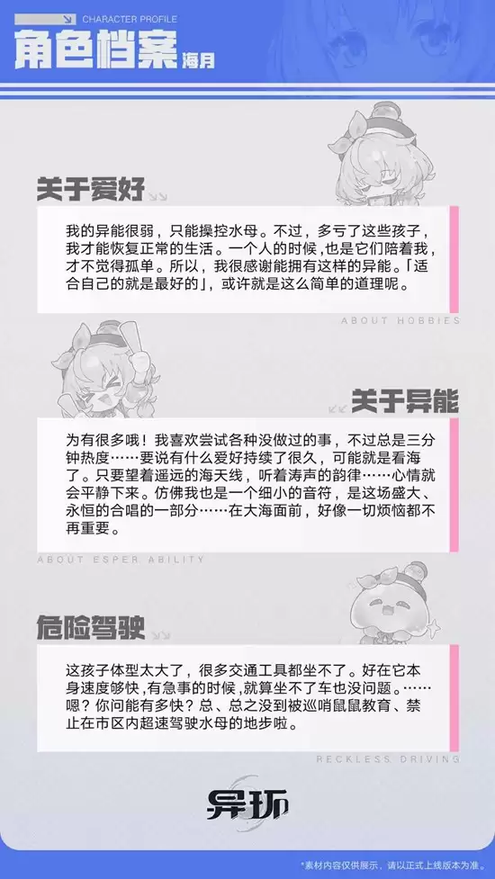 海月隶属于乐队相关剧情线,其战斗机制围绕异能展开,具体技能组合与连招方式将在公测版本中完整呈现。从PV展示来看,该角色具备独特的视觉设计与战斗动作,将为玩家提供差异化的战斗体验。