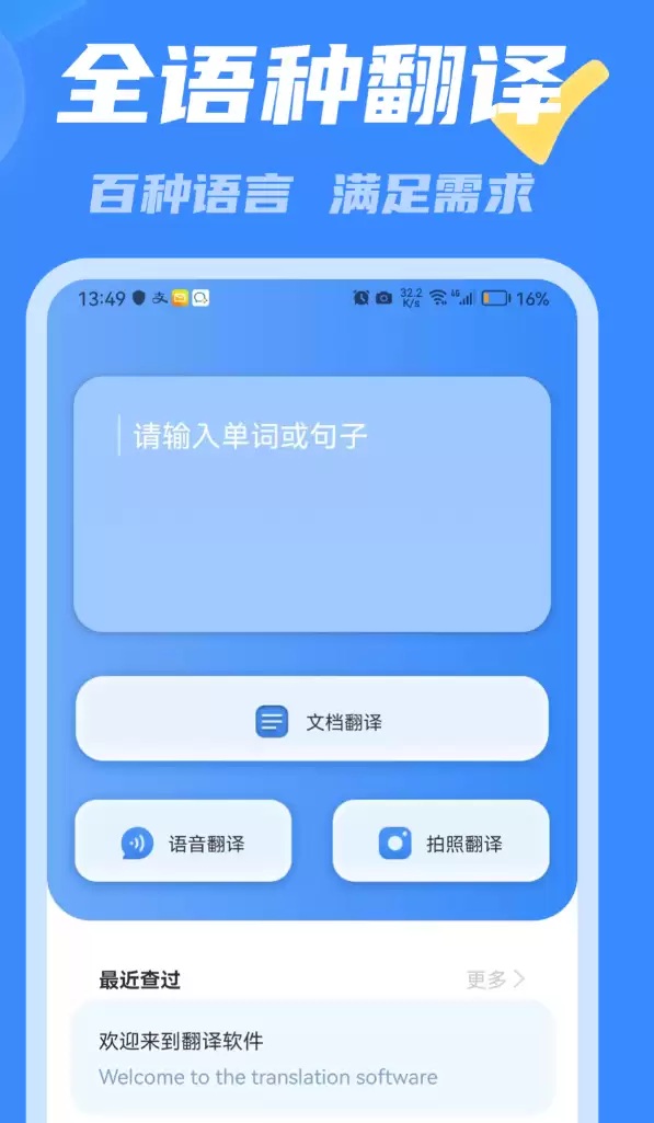 以轻量化与无障碍设计见长,启动即见主功能面板,全程无广告干扰、无捆绑插件。语种识别全自动完成,无需手动指定源语言;文本翻译结果同步附带典型例句,辅助用户掌握词汇实际用法。语音交互采用上下文感知机制,支持连续自然对话,免去频繁触控切换步骤。拍照翻译模块对倾斜、反光、模糊图像具备较强容错能力,文字提取与译文呈现双环节均保持高清晰度输出。