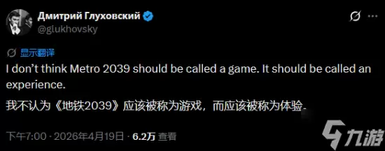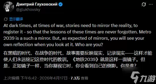 他此前还写道:“在黑暗的时代,在战争时期,故事需要映照现实、记录现实——这样这些时代的教训才不会被遗忘。《地铁2039》正是这样的一面镜子。而镜子的本质,是当你凝视它时,也会看到你自己的倒影。你是谁?”