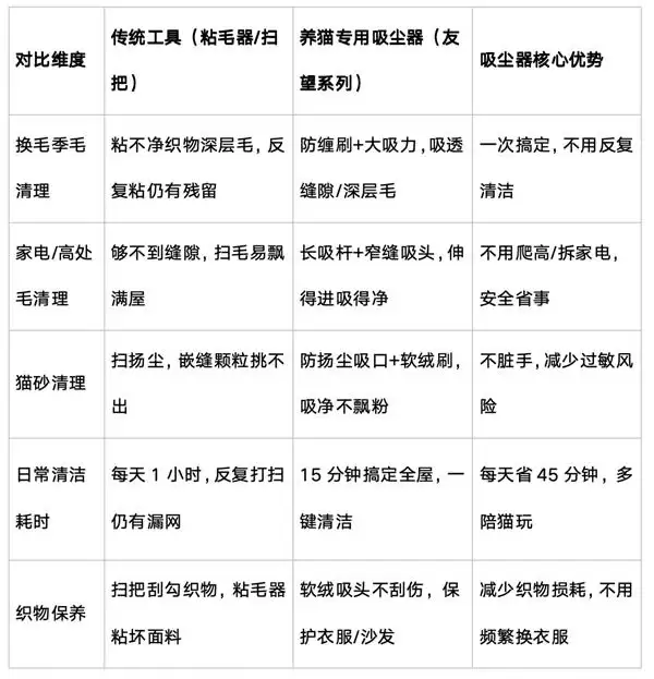 很多人觉得“粘毛器+扫把能应付”,但实测后才知道,这些工具连养猫的基础清洁需求都满足不了,而吸尘器的定制刷头能精准戳中痛点——