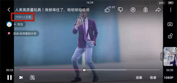 第三步:查看左上角实时数据。 切换至全屏模式后,请观察视频画面的左上角区域。那里跳动的数字,就是此时此刻与你共同观看的实时人数。