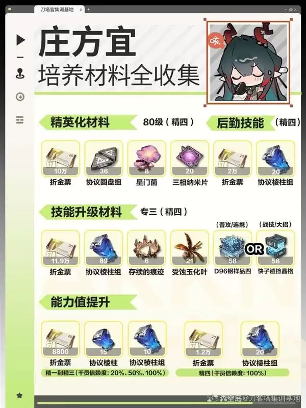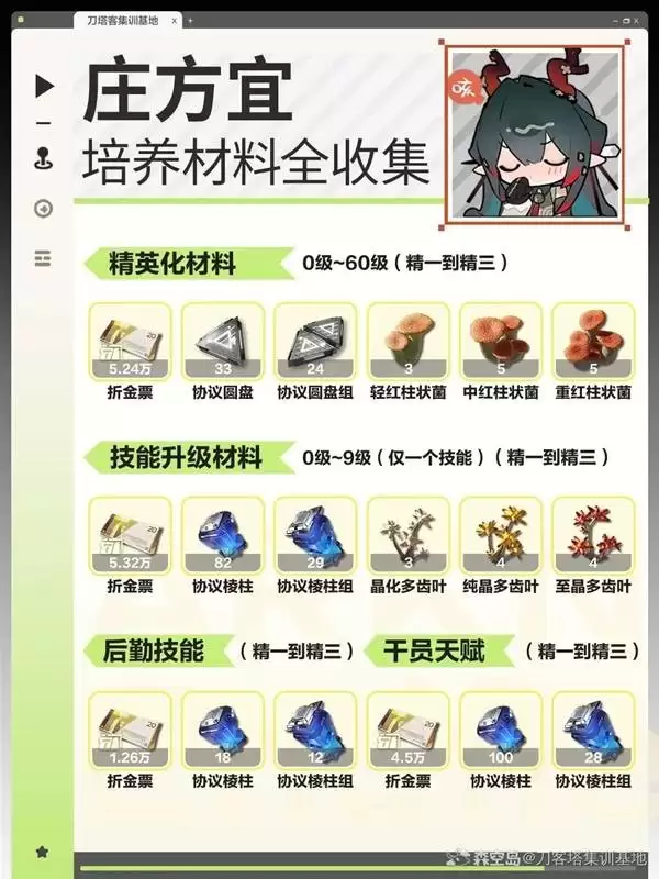 新限定角色庄方宜上线,其完整培养需要多少资源?这份材料清单就是你的“购物指南”。提前规划,能让你在版本活动中目标明确,事半功倍。