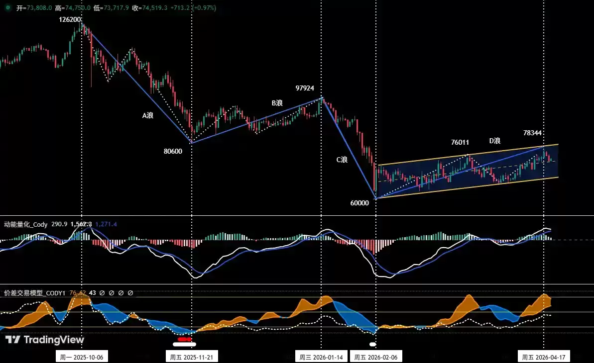 - D浪反弹(当前进行中/可能未段):始于2026年2月6日低点60,000美元,截至4月19日,已运行约73天,最大涨幅约30.6%(从60,000至78,333美元)。本轮反弹的特征非常明显:时间漫长、结构复杂。目前,它正面临关键时间窗口与价格阻力区(如79,000-80,600美元)的严峻考验。如果D浪成立,那么在币价反弹结束后,市场将可能迎来与之对应的“E浪”调整。