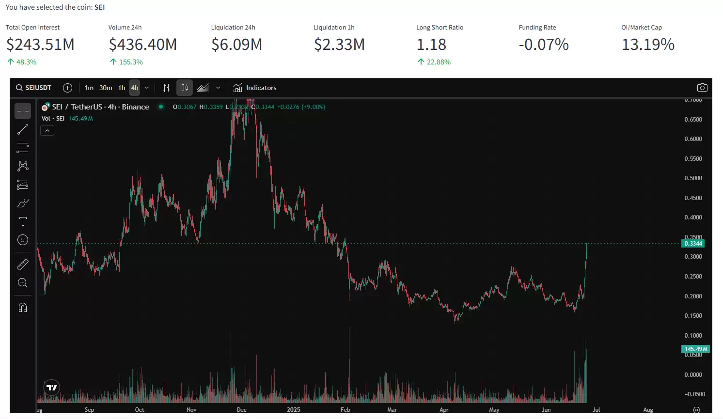 同时,交易所成交量巨幅跃升155%,至4.364亿美元。这共同指向一个事实:大批新资金正涌入SEI衍生品市场进行布局。