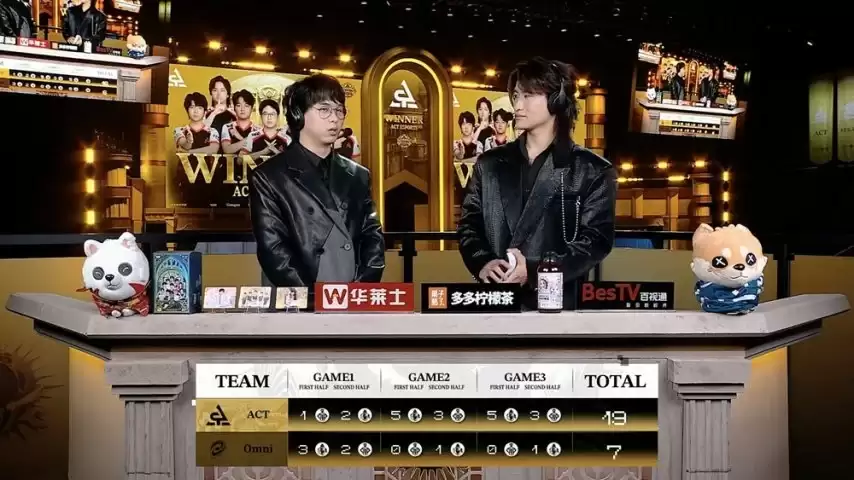 经过三轮激烈较量,ACT战队以总比分2胜0平1负(19:7)战胜Omni战队,赢得这场关键小组赛胜利。