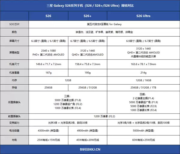 先看三星Galaxy S26系列手机(S26/S26+/S26Ultra)规格对比: