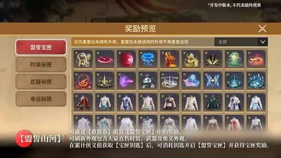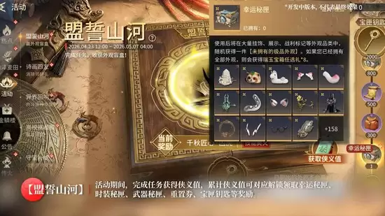 活动二:盟誓山河限时上线。4月23日起,盟誓山河活动正式开启。玩家通过完成指定任务获取侠义值,累计侠义值可解锁4款随机未拥有极品外观,零门槛扩充衣橱。同时,活动还将开放盟誓宝匣,该宝匣支持奖励重置功能,玩家可反复刷新宝匣内容,直至刷出心仪的奥义特效外观或极品时装。这一机制大幅提升了获取心仪道具的概率,让每位玩家都有机会拿到最想要的奖励。