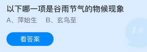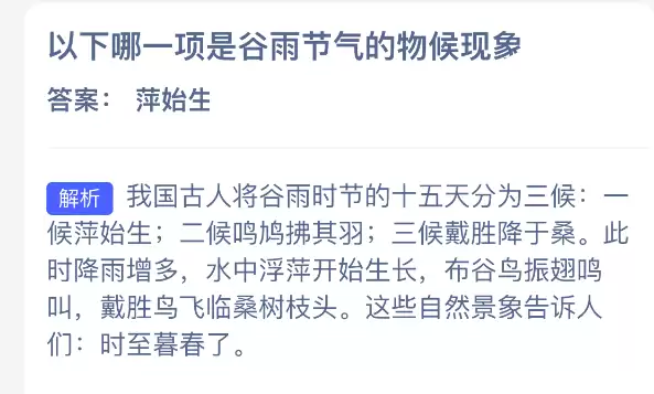 以上就是“以下哪一项是谷雨节气的物候现象?”支付宝蚂蚁庄园2026年4月20日答案的最新内容。