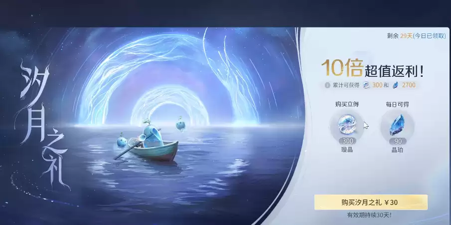 月卡服务“汐月之礼”定价30元,购入即赠璇晶与晶珀两种核心养成资源。订阅后每日可领取300璇晶与90晶珀,连续领取周期为30天。上述资源可用于参与祈愿抽取、限时活动兑换,亦支持角色形象深度定制——例如染发、妆容微调等个性化操作,均需消耗相应数量的璇晶。