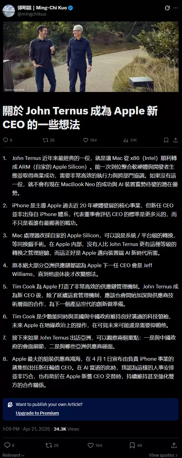 郭明錤谈苹果新CEO特努斯:经典一役是让Mac从x86转向自研芯片