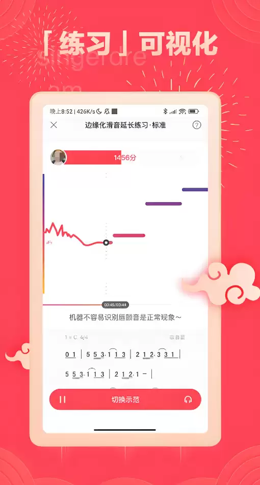 以高品质音频处理见长,伴奏资源达CD音质水准,支持无损级伴奏下载与本地加载。内置专业级音频增强模块,包含环境混响模拟、背景降噪、人声聚焦、频段均衡等多项参数调节选项。独创多维度评分体系,从音准、节奏、气息、表现力四个维度生成可视化分析报告,帮助用户精准定位薄弱环节,实现针对性突破。