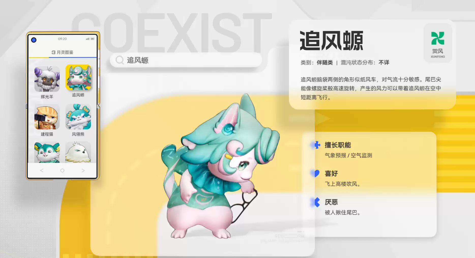追风螈具备巽风属性特征,其头部两侧呈纸风车形态的感知器官可实时捕捉微气流变化,尾端旋转结构支持最高3秒持续滞空。该月灵被部署于城市气象中枢节点,向玩家同步推送未来24小时逐小时天气趋势、PM2.5浓度波动曲线及紫外线强度预警信息。日常行为模式显示其高频驻留于超高层建筑顶部平台,但交互过程中须规避尾部物理接触,否则将触发防御性气旋扰动,导致数据传输延迟。