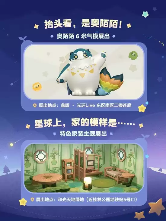 活动内容方面,官方准备了多重互动体验。毛绒绒的奥陌陌将突破屏幕来到现实,玩家不仅可以与超大奥陌陌气模装置合影留念,还能与奥陌陌人偶进行快闪巡游及拥抱互动,完成游戏中无法实现的温暖贴贴。特色家装展出也是本次活动的亮点之一,游戏内精心设计的主题家装将以快闪盒子的形式在线下还原呈现,种星人可以提前感受星际田园生活的布置美学。