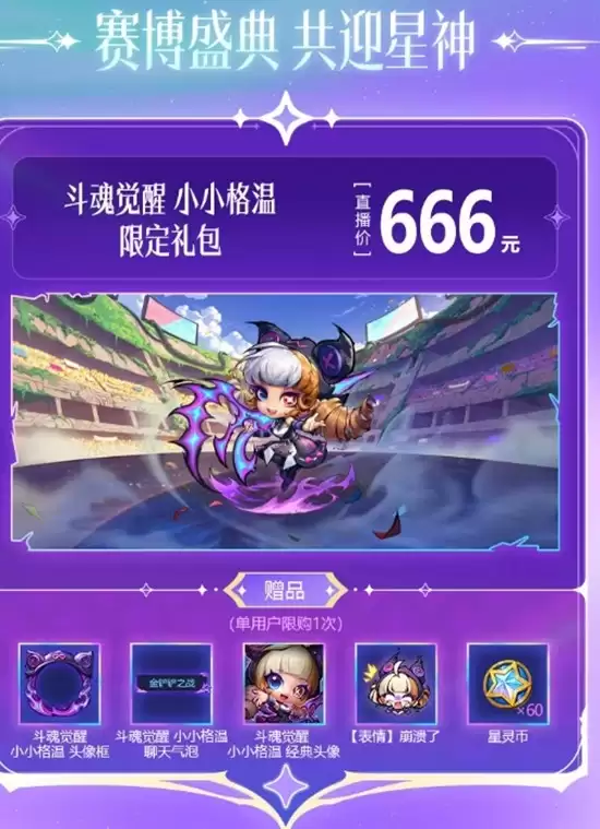 限定小小英雄礼包是本次上新的核心内容。斗魂觉醒小小格温限定礼包直播价666元,包含斗魂觉醒小小格温及专属头像框、聊天气泡、头像、表情等赠品。赛博朋克小小永恩组合礼包直播价860元,包含宇宙创生头像框、聊天气泡、赛博朋克小小永恩头像等配套装饰。福星仙子小小艾瑞莉娅一星直播价86元,附赠表情、纪念头像及专属头像框。