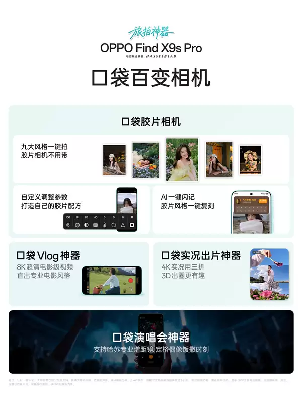 除了硬件升级,OPPO Find X9s Pro还提供了多种影像玩法。全新的哈苏大师模式带来了9大经典的原生胶片风格,让用户不再需要额外携带沉重的胶片相机。