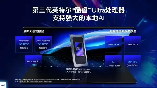 ●主流配置:采用第三代酷睿Ultra 8核/16核处理器并配备16GB以上内存,可高效运行Qwen3.5(9B/4B)等中量级语言模型,并支持Qwen3-TTS、Z-Image-Turbo等文生音、文生图应用,也支持入门级模型和应用。