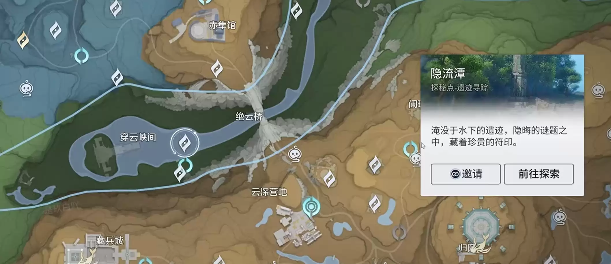 传送抵达后,立即将视线移向左上方。你会看到一个名为“伏流窟”的探秘点,径直前往。