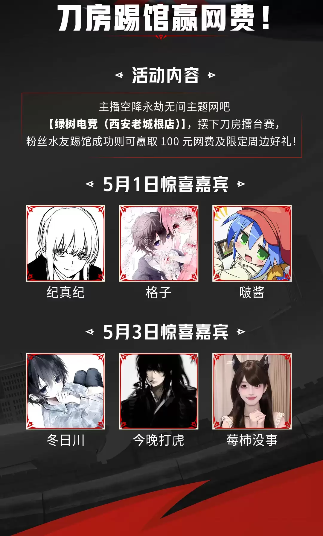 纪真纪、冬日川等多位主播将空降永劫无间主题网吧——绿树电竞(西安老城根店),开设刀房擂台赛。前来踢馆的水友若挑战成功,即可赢得100元网费及限定周边好礼。不妨来线下试试你喜爱的主播究竟实力如何。
