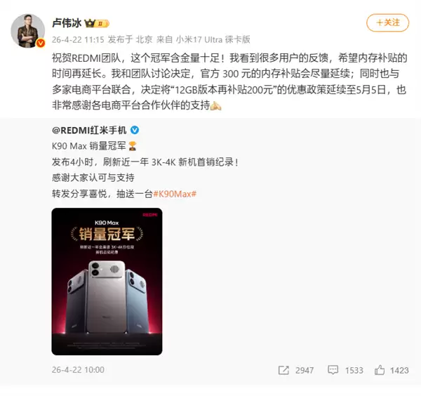 依然2999元起!卢伟冰:REDMI K90 Max内存补贴时间延长