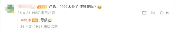 此前有网友在评论区询问2999太香还赚钱吗”,卢伟冰直言:亏损。