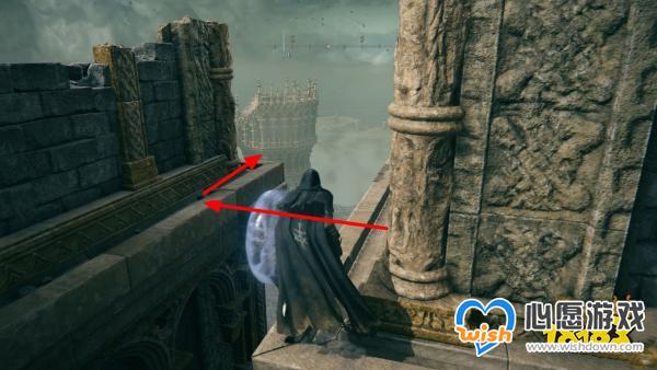 通过楼梯来到城堡顶部后,通过木台跳到城堡女儿墙上,沿着下图所示线路前进。