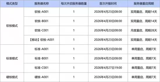 2026年4月23日版本更新后,禁区模式将根据不同模式开启服务器,服务器名称也将按照模式来区分显示,详细开服计划和规则如下: