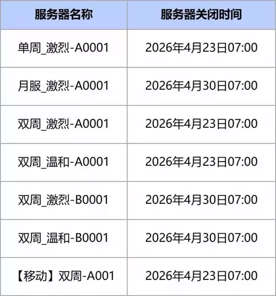 2026年4月23日版本更新前已开启的服务器将正常运行至服务器自然结束,结束后不再重启,相关的服务器列表如下: