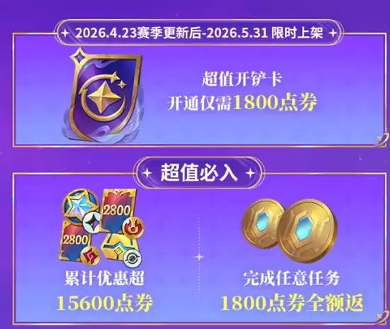 活动期间,弈士仅需1800点券即可解锁【超值开铲卡】。作为新赛季专属福利卡,开铲卡为玩家提供了丰厚的任务回报体系,首期累计可享优惠超过15600点券,性价比极高。对于计划在赛季初期投入养成的弈士而言,开铲卡无疑是必入的省钱利器。
