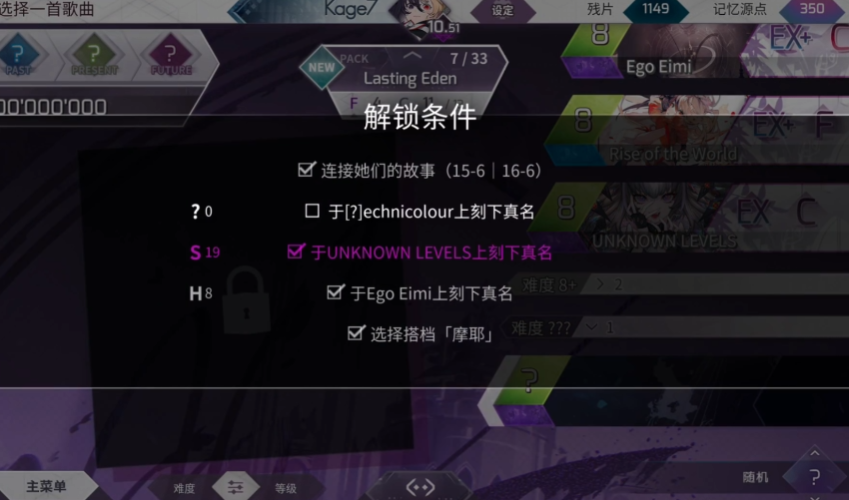 等剧情章节过了就到了最关键的三个解锁任务,第一个任务是玩《technicolour》这首曲子,不用整首播完,只要在演奏过程中达到指定的连击数,直接退出就行,刚开始可能会不小心多打几下或者没到目标就断连,多试几次找到曲子前半段节奏平缓的部分,集中注意力按准音符,很容易就能达成条件,第二个任务是玩《unknown levels》,需要先把音符流速调到一个特定的中等参数,这个流速不算快也不算慢,刚开始换流速可能会有点不适应,眼睛和手的配合需要调整一下。