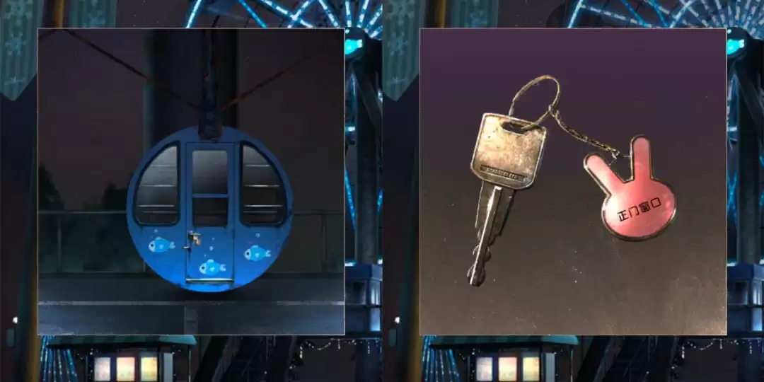 接下来的任务很明确:在转动的座舱中,找到那个外壁绘有同样“鱼”图案的特定座舱。点击放大它,你会发现座舱的门上挂着一把钥匙。拿走它。